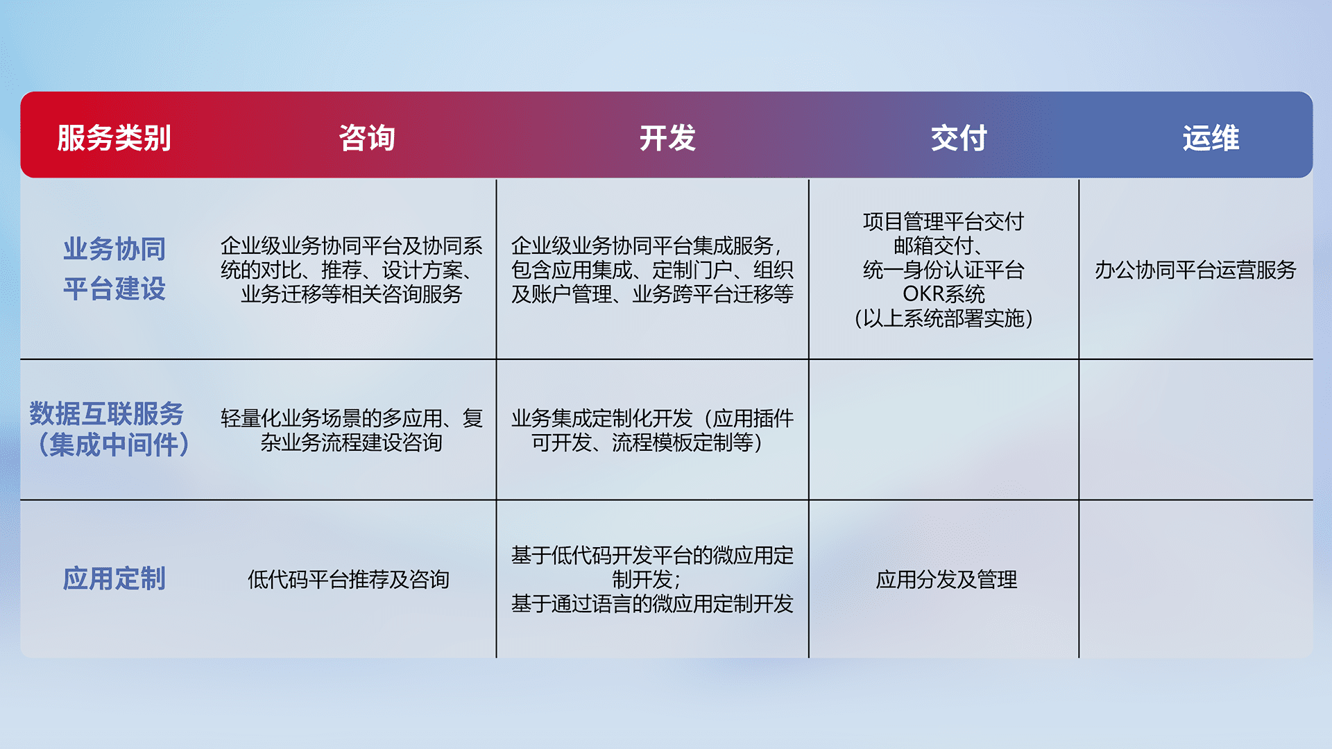针对钉钉、、企微、、、、IDaas等平台级产品提供产品的规划、、、方案、、、、交付、、、定制化开发等服务,,,实现如统一协同办公、、、智能客户服务、、混合会议管理、、智能数据查询、、、等业务场景,,,实现数字化转型。。。。