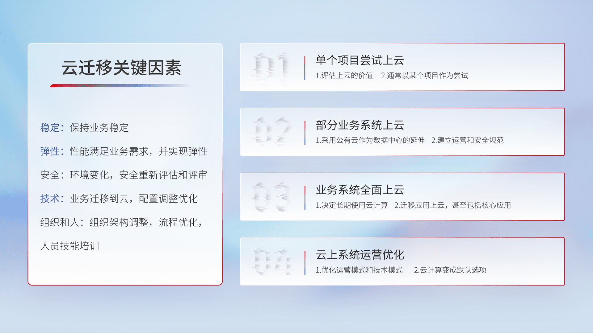 结合实际业务,,,,从规划设计、、云平台选型、、云原生改造、、数据迁移、、、、集成交付,,,,迁移全过程为客户识别最佳上云路径,,,做好风险识别管理,,,设计网络架构、、、身份权限、、、安全审计合规、、操作审计、、、日志审计、、、监控告警策略、、、多站点容灾设计等,,,,对云上基础设施进行整体规划,,提升IT治理水平,,,以满足弹性、、、、高可用、、、高性能的需求。。。