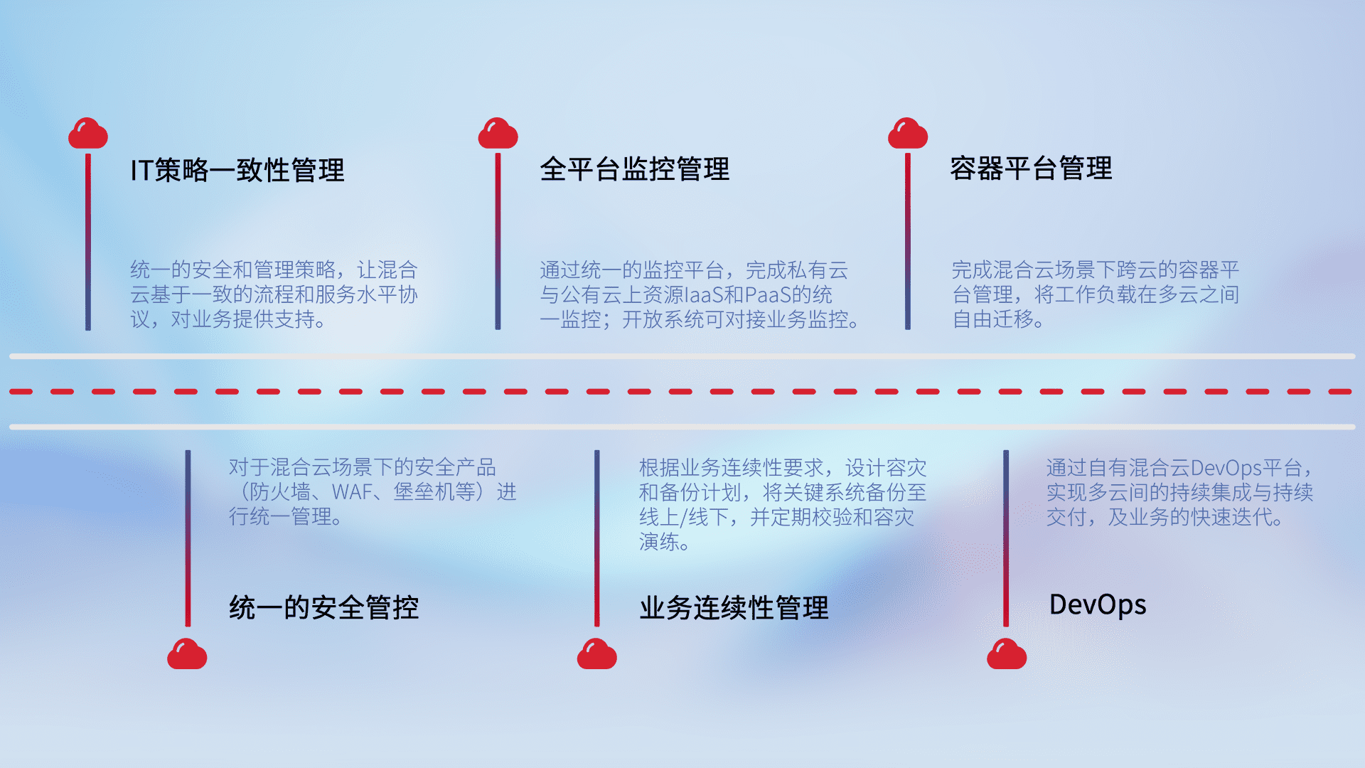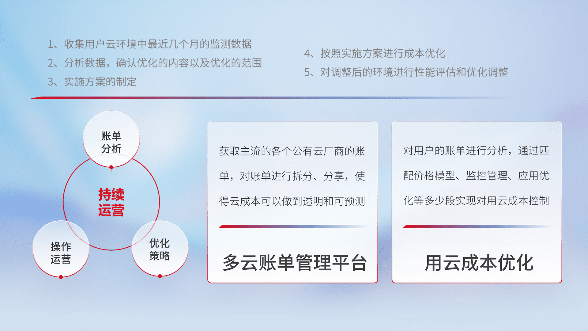 通过多云纳管,,,,以统一的资源数据模型把客户的云资源进行抽象和封装,,,进而实现对多云资源的统一操作,,保障云资源管理的可靠性、、稳定性与可用性。。。量身定制化运维内容,,,,配置、、、、开发运维、、、补丁管理、、备份、、、、监控、、认证和访问管理、、审计和日常巡检等,,,,保障在用云过程中的可靠度,,,,稳定度以及高可用率。。。