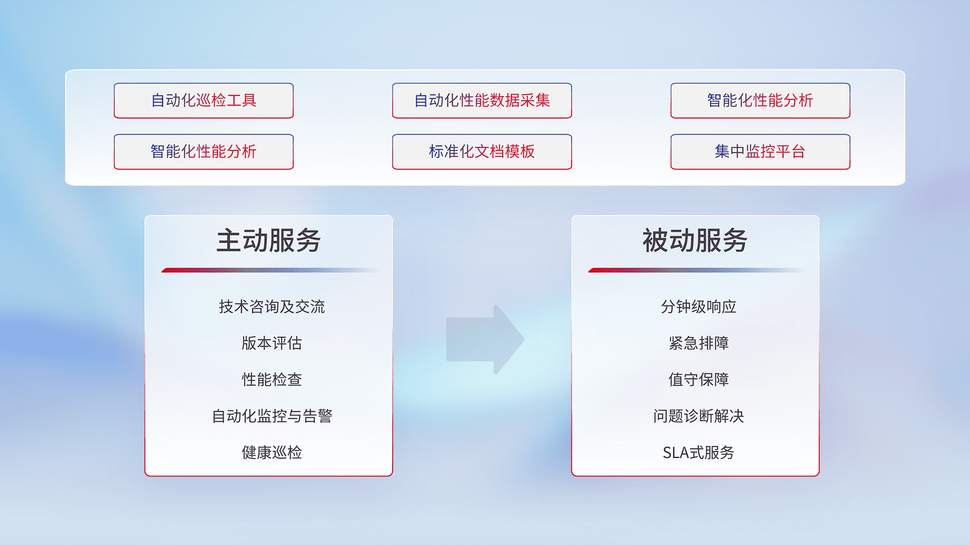 智能化工具和标准化文档,,,,保障服务质量,,,提供主动服务(包含技术咨询、、、、版本评估、、、性能检查、、自动化监控与告警、、、、健康巡检)和被动服务包含(分钟级响应、、、、紧急排障、、、、值守保障、、问题诊断解决、、、SLA服务)。。。